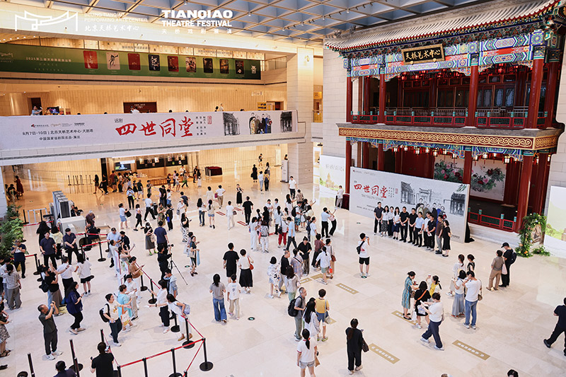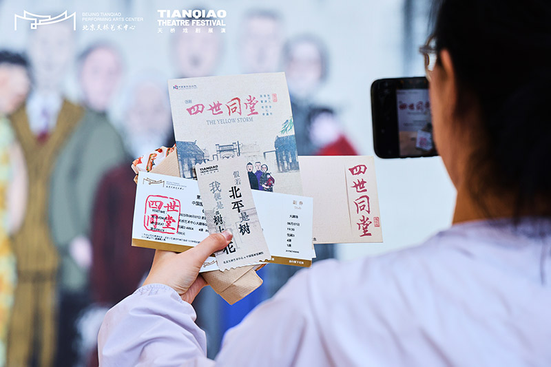 演出开场前,天桥艺术中心前厅已是人潮涌动。众多观众们在《四世同堂》主题背景前驻足留影,领取限量纪念票根与天桥独家纪念票夹的队伍蜿蜒成行。观众手持宣传单页热切交流,期待之情溢于言表。
