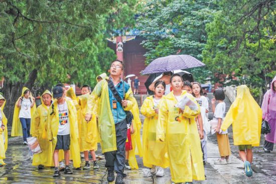 昨天,孔庙和国子监博物馆内,研学团队和游人雨中参观研学,热情不减。 本报记者 武亦彬摄