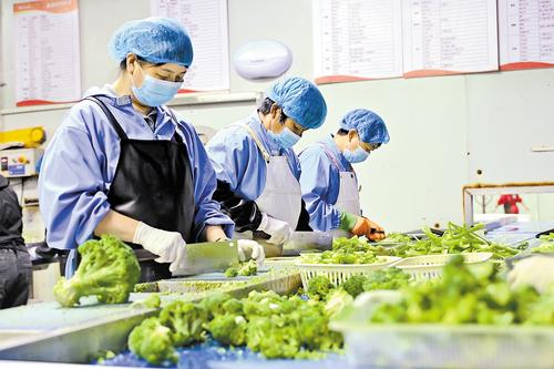 近日,河北农速源冷链物流有限公司净菜加工车间,工人们在切配新鲜的蔬菜。本报记者 焦 磊摄