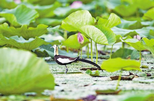 截至目前,白洋淀野生鸟类增加至296种。图为7月7日拍摄的水雉在白洋淀栖息觅食。 本报记者 刘光昱摄