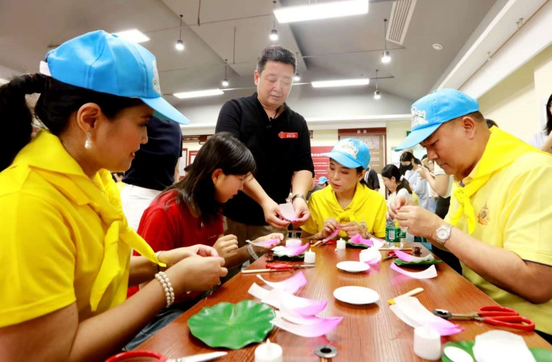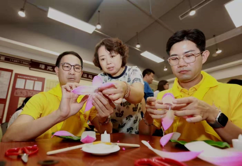 灯彩是北京市朝阳区传统美术,在2008年经国务院批准列入国家级非物质文化遗产名录。在灯彩制作环节,安贞街道市民活动中心“灯彩传习所”马海捷老师详细介绍了北京灯彩的深厚文化底蕴,并指导大家按流程逐步制作荷花灯,泰国大使馆志愿服务团队成员与社区居民、青少年儿童结对协作,积极互动,在交流合作中感受传统灯彩之美。