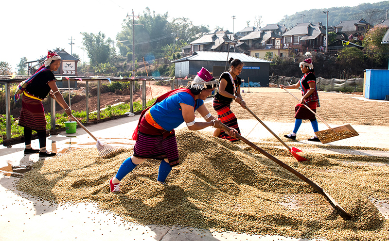 云南咖农们正在晾晒咖啡豆