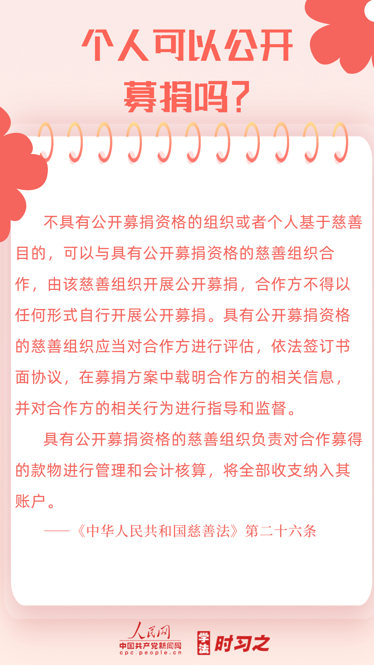 今年9月5日是第十个“中华慈善日”。个人可以公开募捐吗?公开承诺的捐款却不兑现怎么办?遭遇骗捐如何讨回公道?这些公众关心的热点话题,慈善法如何回应的?一起来学习。