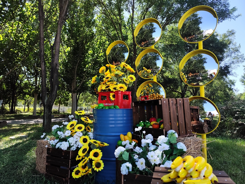 基础地景方面,五大区域各有特色:南门至花神广场借鉴英式园林美学,以千头菊、硫华菊、马鞭草搭配高枝紫菀、宿根鼠尾草等花卉打造兼具景深与韵律的“植物剧场”;百花田至樱花大道以缓坡为画布,用醉蝶、麦秆菊勾勒流动色带,东翼大波斯菊与跳泉旁的球菊矩阵,演绎秋日华章;幻花湖至水杉林借湖面倒影打造“镜中花海”,呈现反季节花卉与亲水植物的梦幻交融;大地花海北区融合荷兰花海设计手法,蓝紫色马鞭草花海与机械雕塑跨界碰撞;大地花海南区则用蓝紫色花境搭配“云端漫步”艺术装置,形成自带氛围感的网红打卡地标。