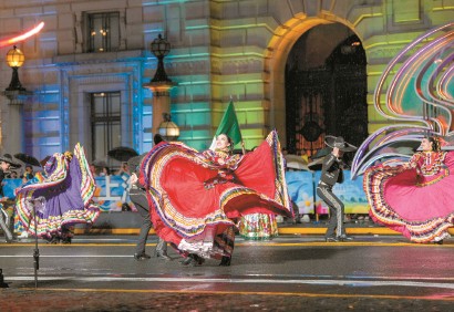 昨晚,2025年第36届上海旅游节大巡游活动在外滩中山东一路揭幕。这也是上海旅游节36年来花车巡游活动首次来到外滩。图为墨西哥萨波潘神庙与墨西哥精神民族舞团带来热情奔放的表演。 本报记者 孟雨涵 摄
