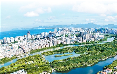 海南三亚市,碧海蓝天,河清树绿。 |