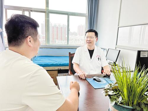 9月16日,中国人民解放军火箭军特色医学中心肝胆外科医生刘军桂(右)在黄骅市人民医院为患者诊断病情。本报记者 李 傲摄