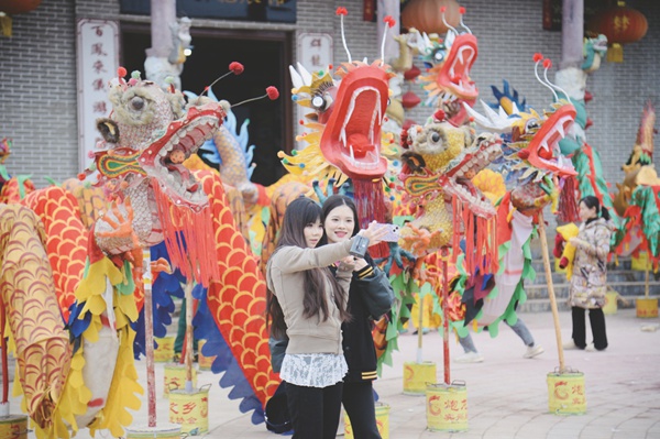 游客在宾阳县炮龙文化园拍照打卡。(资料图)