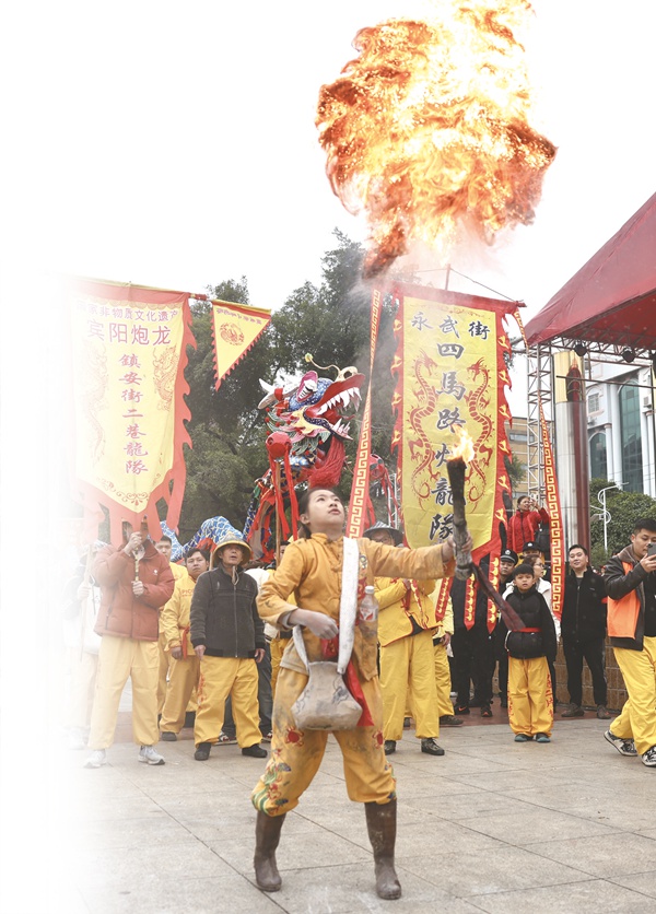 今年初举行的宾阳非遗巡游活动,10岁女孩担任火焰手引人注目。(资料图)