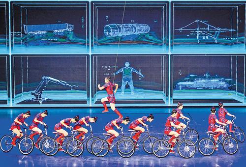 9月28日,河北省杂技团演员正在吴桥江湖大剧院表演《雏凤凌空—— 女子集体车技》。 本报记者 李东宇摄