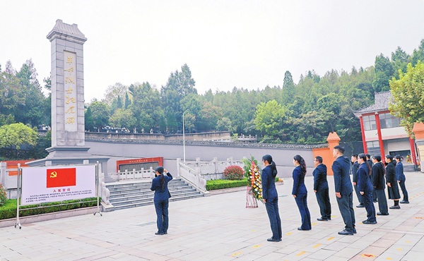 活动在庄严的国歌声中拉开序幕,干警们整齐列队,肃立于革命烈士纪念碑前,深切缅怀革命先烈。在领誓人的带领下,干警们重温入党誓词。随后,干警代表向革命烈士纪念碑敬献花篮,表达对革命先烈的深切缅怀与崇高敬意。图为干警重温入党誓词。肖冰洁 摄