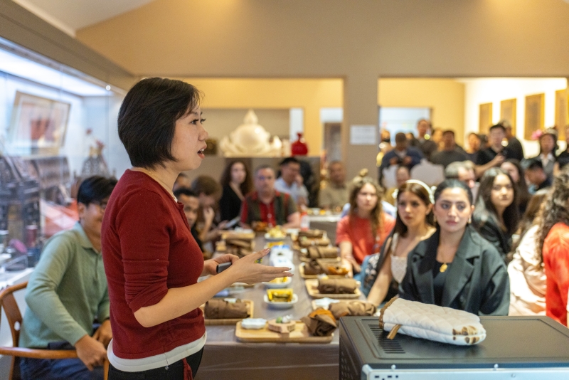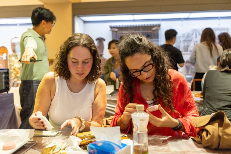 活动在充满文化韵味的博物馆参观中拉开序幕。中外青年沿着 “汉唐至今传统点心模具发展史”脉络,近距离观赏新石器时代石碾石臼、元明清时期吉祥纹样点心模具等藏品,从器物细节中感知古人对生活美学的追求与匠心传承,感受“神农尝百草”“举案齐眉”等文化传说与传统美德的传承。随后,中秋民俗文化分享环节生动讲述中秋节的故事传说与民间习俗,进一步加深了外国青年对中秋节文化内涵的理解。
