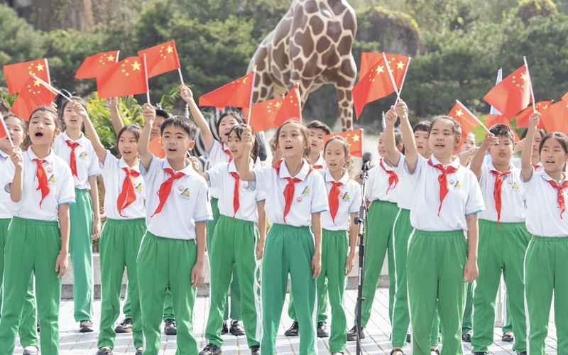 在北京野生动物园的步行区迎宾湖广场上,来自海淀区五一小学大兴一分校和大兴区滨河小学的同学们精神饱满,身着整齐服装,手执国旗,深情演唱《歌唱祖国》《没有共产党就没有新中国》《今天是你的生日,中国》等经典曲目。动人的歌声、优美的旋律瞬间吸引了众多游客驻足倾听,大家情不自禁地跟着节奏拍手、哼唱,爱国情怀在互动中持续升温。游客们也来到孩子们中间,大家一同高歌,共同庆祝节日。
