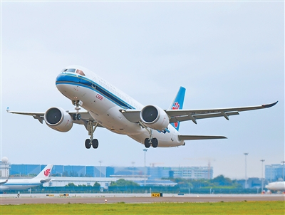 浙江省杭州市,南航国产C919客机从萧山国际机场起飞,飞往广东广州。C919实现从首飞到首航,再到常态化商业运营,目前累计获得国内外订单超1000架。 |