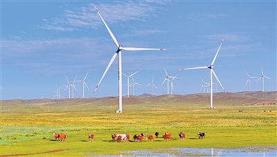 内蒙古自治区乌兰察布市,风力发电机将风能转化为绿色电能。 |