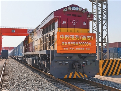 陕西省西安市,满载光伏组件的中欧班列从西安国际港站驶出。