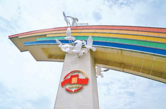 彩虹穹顶,14只和平鸽展翅翱翔,象征光明前景;立柱布置纪念活动标识,彰显仪式的庄严庄重。建国门和复兴门的两处彩虹门纪念主题景观,成为长安街一景。