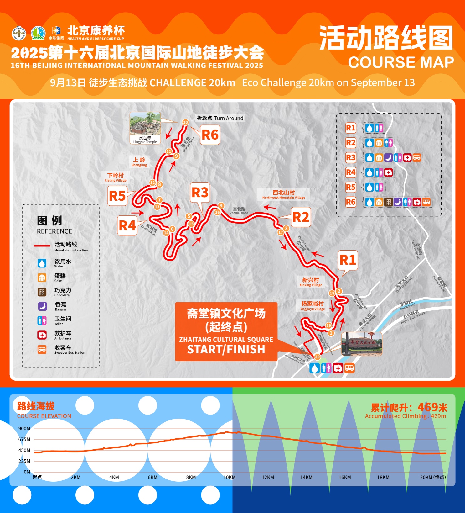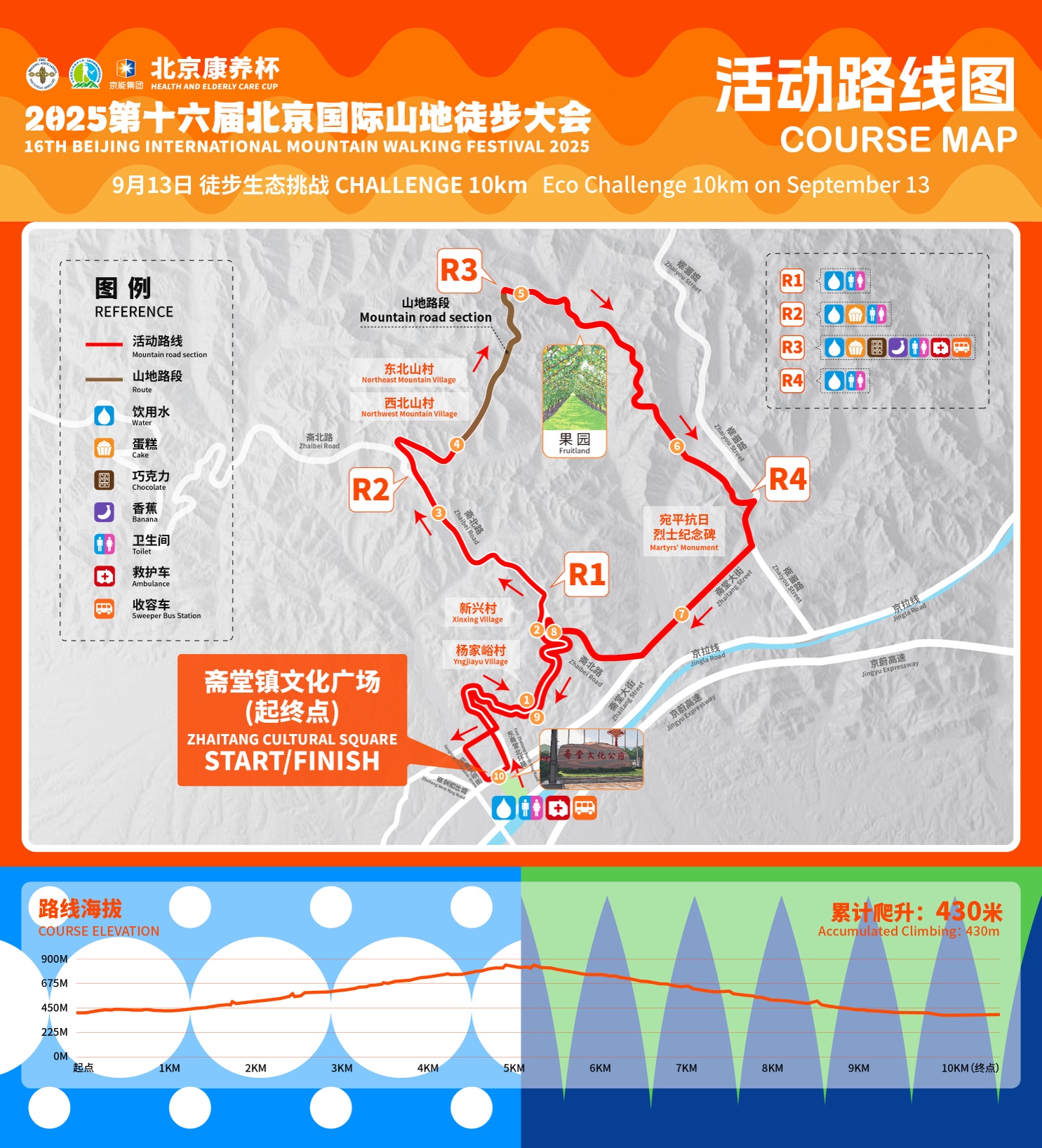 9月13日开启的徒步生态挑战路线设置有20公里和10公里两个长度的路线。其中, 20公里路线从斋堂文化广场出发,沿斋北路至千年古刹灵岳寺折返。徒步者沿途不仅能欣赏层峦叠嶂的山地风光,还能领略到始建于唐贞观年间的灵岳寺,在运动中感受古建美学与禅茶意境。另外,10公里路线将田园风光与红色记忆结合,途径宛平抗日烈士纪念碑,途中约1公里的山石路段更增添了徒步的趣味性与挑战性。
