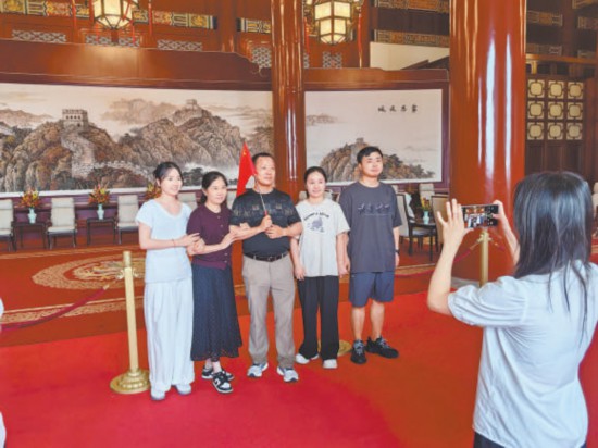 昨天中午12时,天安门城楼恢复对市民游客开放。尽管下着雨,市民游客对参观打卡城楼仍热情高涨。