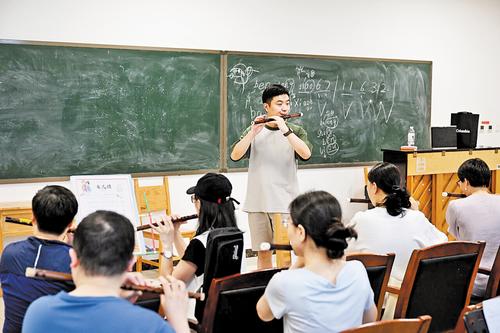 近日,河北省群艺馆青年夜校老师在教学员吹奏笛子。 本报记者 史晟全摄