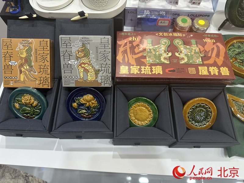 除了传统器型和式样,金隅琉璃文化创意产业园还带来了多款符合年轻人消费需求的文创产品。展位前,参观者纷纷驻足欣赏牡丹祥瑞冰箱贴、“稳稳的幸福”鸱吻造型冰箱贴,以及龙纹瓦当和取材于九龙壁的摆件。“我们希望通过文创产品,一方面展现琉璃的特色工艺,另一方面契合现代人的审美和实用需求。”张磊表示,这种传统与现代的交融,让非遗技艺变得可触摸、可感知、可传承。