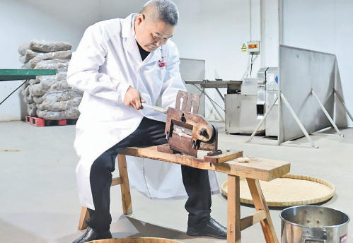 8月20日,在河北汉草堂药业有限公司,省级非物质文化遗产代表性项目安国中药材加工炮制技艺市级代表性传承人刘峰展示“蝉翼清夏”加工技艺。 贾宗霖摄