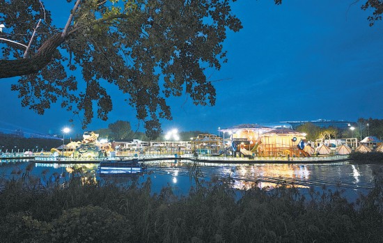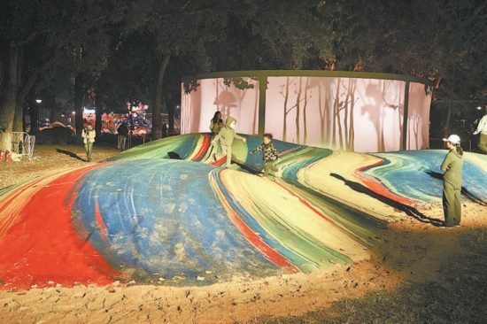 朝阳公园中心岛,孩子们在灯光彩饰的沙滩上玩耍。