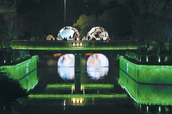 观澜桥上,灯光艺术装置美轮美奂。 本报记者 程功摄