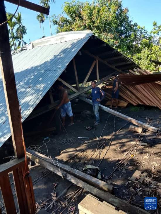 10月16日,在印度尼西亚巴布亚省萨米县,人们站在受损的房屋旁。