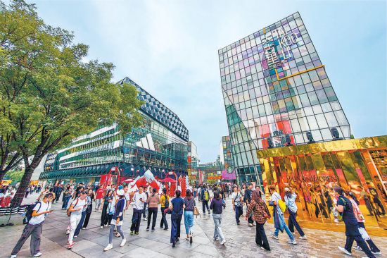 在三里屯太古里,游客往来不绝,体验京城潮流前沿商街。本报记者 邓伟摄