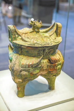 这次展览,被誉为“鼎天鬲地”组合的国宝级文物堇鼎、伯矩鬲,实现了“合璧”展出。参观完“双重城垣”复原图,再往展厅里面走就能看到它们。