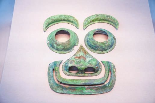 除作册奂器、堇鼎、伯矩鬲、圉簋、伯鱼簋,本次展览还展出了克盉、克罍等重磅文物。记者在现场还发现了三组颇有“网红”潜力的组合人面形饰。其中,最大的那组由6个零件组合而成,双目圆睁、阔鼻大口、嘴角上扬,像是位浓眉大眼的“喜剧演员”。