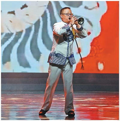 内蒙古代表队演员表演唢呐独奏《训战马》。