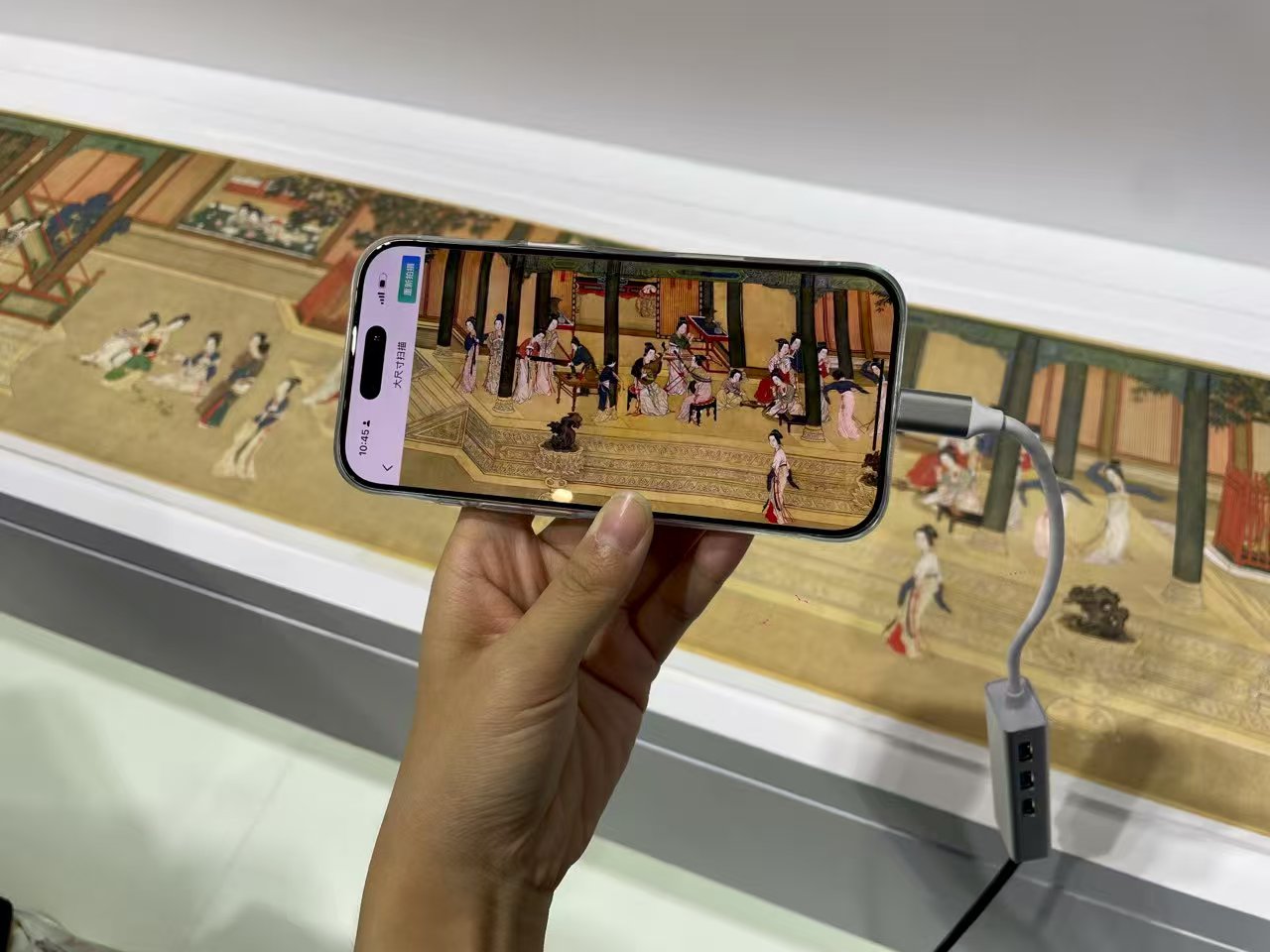 以《汉宫春晓图》为例,该画卷长度超5米,被誉为中国“重彩仕女第一长卷”。在现场,画卷平铺放置,观众通过上下、左右滑动拍摄视频,AI便可自动消除大尺寸文档图像拼接常见的错位、细节模糊、色彩失真等问题,对局部视频进行“智能拼图”。观众仅需移动手机,就能完整记录高清长卷,清晰观察到古人浇花、观鸟、闲唠嗑等生动细节,实现“让文物说话,让历史发声”的体验。