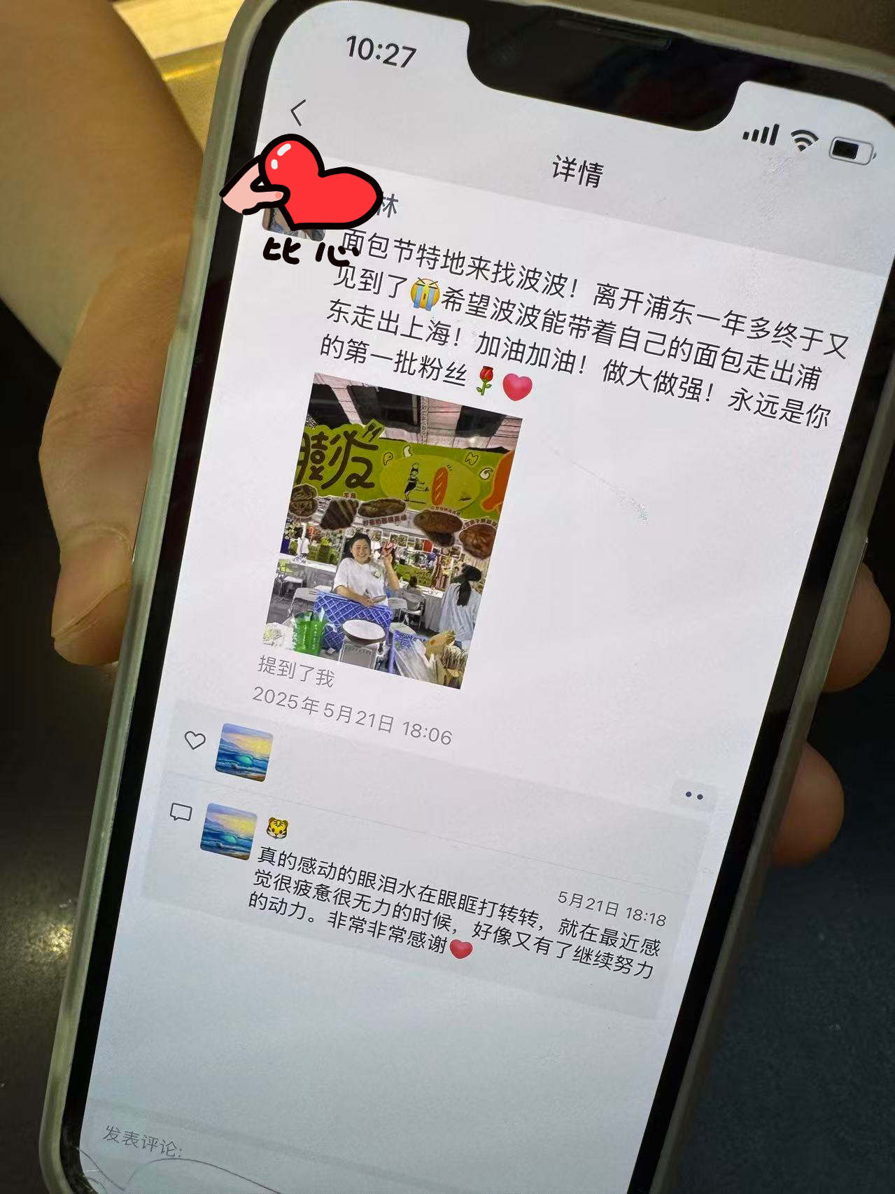 最近一次面包节在虹桥布展,汪波也受邀参展。一位搬到虹桥的老顾客特意寻来汪波的摊位,话语滚烫:“虽然你家店铺很小,知名度也不高,但你一定要坚持做下去。”汪波一边展示着当日“老粉”发的朋友圈,一边哽咽道:“我做的面包能被顾客这样心心念念,可真好啊。”