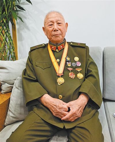 9月6日,北京西三环,某干休所。得知记者来访,99岁的抗战老兵申秉宸(见图,本报记者王昊男摄)特意穿上军装,胸前那枚“中国人民抗日战争胜利80周年”纪念章在阳光下熠熠生辉。