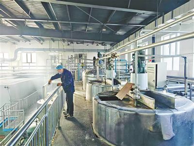 内蒙古富健源食品科技公司工人在生产车间观察水洗罐中半成品油液位和温度控制情况。受访者供图