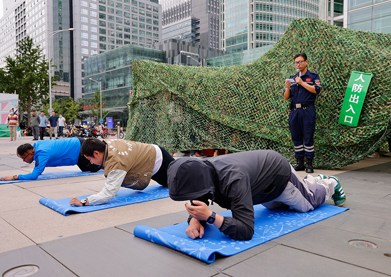 活动现场,西城区合力减灾中心开展了模拟实战的防空袭掩蔽演练,现场教授辖区群众在紧急情况下如何快速、有序、安全地进行掩蔽防护。活动现场还邀请了西城区武装部、区反恐办、区红十字会、展览路街道无线电团队等相关单位参与,结合各自工作职能现场“摆摊宣传”,通过装备设备展示、互动体验、现场教学培训等形式,向参与人群科普展示设备、专业知识、技能演练、法律法规等内容,提高市民应急能力。