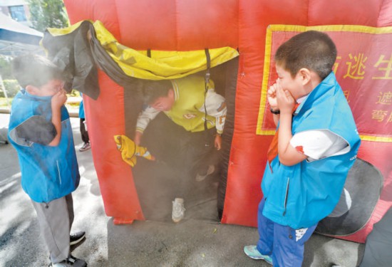 昨天上午,一场应急疏散演练在花市枣苑社区开展。图为社区居民参与消防逃生互动。