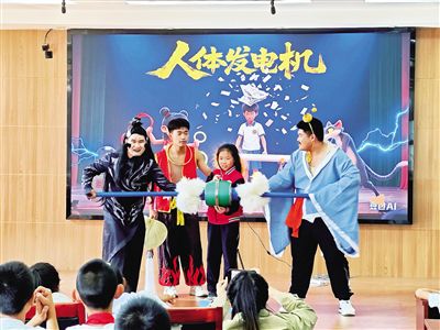 9月18日,内蒙古工业大学理学院的原创科普情景剧《哪吒的科学奇幻大冒险》走进内蒙古工业大学附属小学,为孩子们带来了一场别开生面的沉浸式科学表演。剧情以哪吒、太乙真人和申公豹的趣味互动为主线,将“摩擦起电”“静电传导”“伯努利原理”等物理知识融入生动有趣的实验展示中,让学生们在欢乐中感受到科学的魅力。记者 潘佳慧摄
