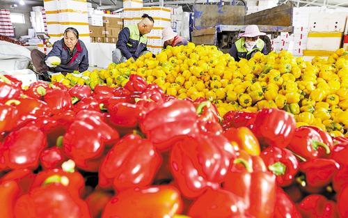 今年,张家口市崇礼区彩椒喜获丰收。近年来,崇礼着力发展冷凉蔬菜产业,已建成全国最大的越夏彩椒生产基地,彩椒种植面积达1.6万亩,年产量超7万吨,带动4000余人实现年均增收3500元。图为9月20日,工人在该区万家乐蔬菜有限公司车间进行彩椒包装装箱。本报记者 耿 辉摄