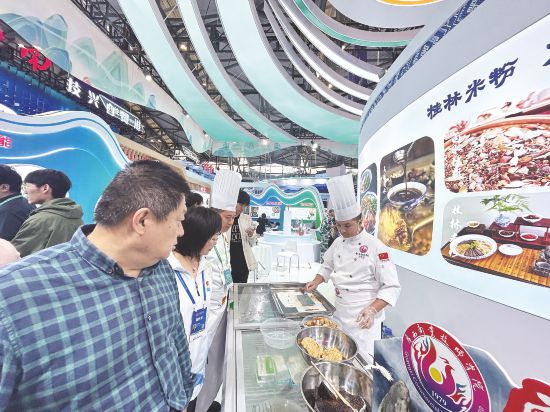 踏入广西馆,桂林米粉制作展位前围满了人。米粉师傅熟练地抓粉、烫粉、加卤汁、放配菜,动作行云流水,一碗热气腾腾、香气四溢的米粉就做好了。“来,尝尝正宗的桂林米粉!”师傅热情招呼,观众细细品尝,纷纷称赞:“这味道,太棒了!”