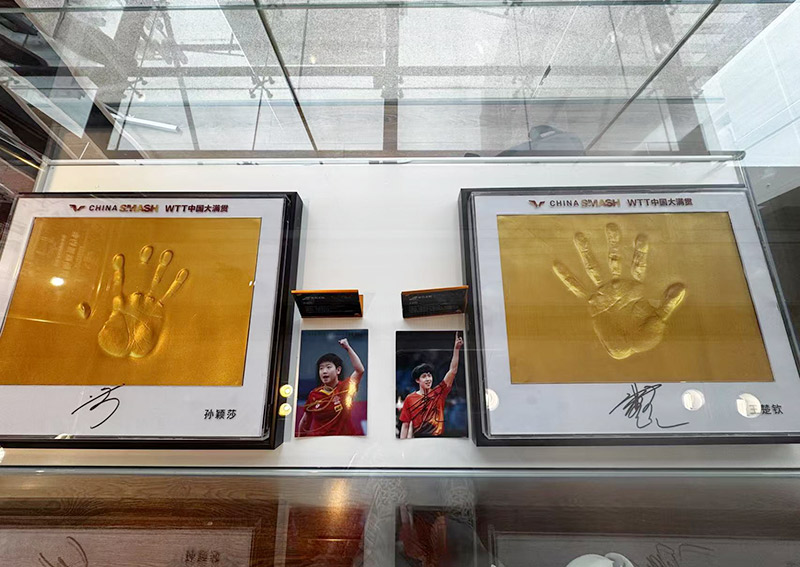 万商花园酒店内展示的乒乓球运动员手模。人民网记者 鲍聪颖摄