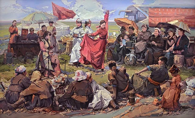 内蒙古师范大学教授张可扬创作的布面油画《草原上的乌兰牧骑》。