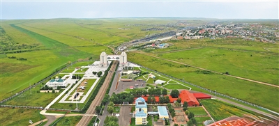 远观满洲里中俄公路口岸,建筑错落、车流穿梭,周边草原广袤,口岸的繁忙与开阔之景尽收眼底。记者 李新军摄