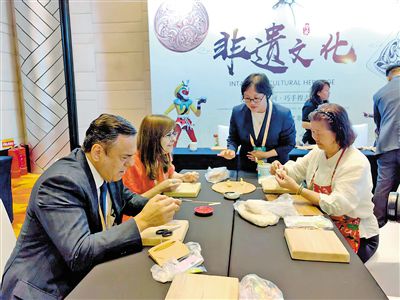 外宾在第五届中蒙博览会2025年国家向北开放重要桥头堡智库论坛非遗文化展区体验。记者 李永桃摄